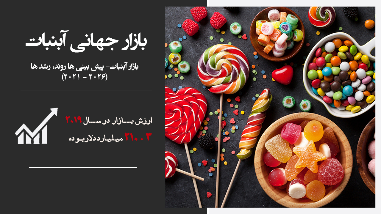 چکیده بازار آبنبات بر اساس نوع محصول (آبنبات های نعناعی، آدامسی و ژله ای، شکلات، کارامل و تافی، آبنبات های دارویی و سایر محصولات)، گروه